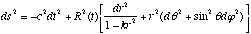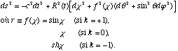 Il s'ensuit que l'espace est à courbure constante, et que l'élément de métrique prend la forme dite de Friedmann-Lemaître- Robertson - Walker (FLRW) :