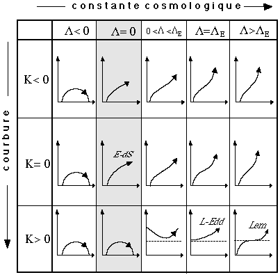 L. Deux valeurs critiques de cette constante sont L = 0 (on retrouve alors les modèles de Friedmann les plus souvent utilisés, dans la colonne en gris; un cas particulier est la solution euclidienne d'Einstein - de Sitter, marquée E-dS), et L = LE, où LE est la valeur proposée en 1917 par Einstein afin d'assurer la staticité de son univers sphérique. Puisqu'une constante cosmologique positive équivaut à une action répulsive à grande distance, tous les modèles à grande constante cosmologique (L > LE), quelle que soit leur courbure, sont "ouverts" dans le temps, c'est-à-dire en expansion perpétuelle. A l'inverse, une constante négative (L <0) contribue à augmenter la gravité effective, de sorte que les modèles d'univers correspondants finissent tous par s'effondrer sur eux-mêmes.Dans certains cas (k>0 et 0 <