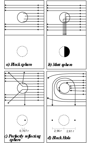 The final case is that of a black hole. The essential difference from the preceding examples is that a black hole is not a tangible hard surface against which light rays can strike and be reflected. It is the black hole's gravitational field which deviates the light rays. The black hole's sphere of influence is not therefore a single sphere - the event horizon - but extends to infinity. The trajectories of light rays are not altered by the impact with a surface, but are curved by the gravitational field. In the experiment where it is illuminated, the black hole's gravitational field deviates several light rays towards the observer. The image of the black hole consists of a series of illuminated spots (Figure 30d). On the left, at 2.96 times the Schwarzschild radius of the black hole, the 'primary' image is produced by light rays which have been deviated by 90deg.. On the right, 2.61 times the Schwarzschild radius the 'secondary' image is produced by light rays which have been deviated through another half circle (a total of 270deg.). The complete calculation of the geodesics of the Schwarzschild space-time corresponding to the trajectories of the light rays shows that there is an infinity of images; the third one corresponds to light which has been deviated by 450deg., and so on adding a half turn each time. However, in practice, the images of order higher than two have such a low intensity and are so close to the primary and secondary images that they cannot be resolved.