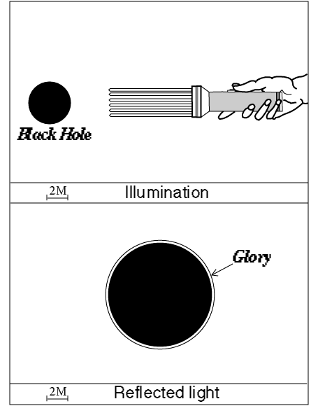 The image of the actual black hole is magnified to 2.6 times its real diameter. This is because a large part of the incident beam is captured by the black hole: not just the radiation which directly strikes the event horizon but also that which passes within 5.2 M of the centre (the true radius of the black hole is equal to 2 M). The black disc appears to be surrounded by a series of concentric light rings. The final result is like the glory effect, well known in traditional optics: when sunlight is scattered by innumerable water droplets in mist, it is sometimes possible to see in reflection the shadow of one's own head surrounded by brilliant rings of light centred on the line of sight.