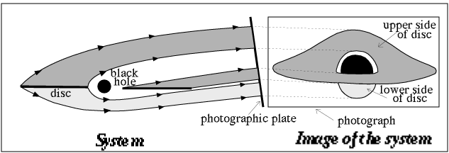 These illumination experiments, although idealised, at least show how a black hole, through its gravitational field, acts on radiation as a sort of lens which multiplies images of a single unique source. Let us now consider a more realistic situation. Rings of matter around celestial bodies have been intensively studied over the last twenty years because they are related to a large number of astronomical phenomena: the planets (Saturn, Jupiter, Uranus and Neptune), and binary star systems where one of the partners is a condensed star (white dwarf, neutron star and black hole). The gravitational field around a black hole sucks in the overflowing gas of its companion, stores it in the accretion disc and slowly consumes it.