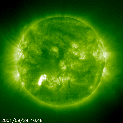 L'éruption est la partie brillante en bas à gauche du disque solaire.