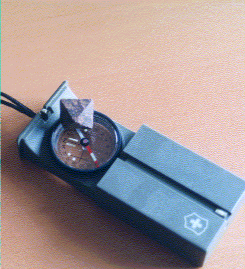 Voici un cristal de magnétite. Il mesure environ 1 centimètre. Il provient d'une mine en Afrique centrale. Ici, la pierre est posée sur la boussole et l'aiguille, initialement dans la direction du Nord sur la boussole, a changé d'orientation, à cause du champ magnétique créé par la magnétite. |