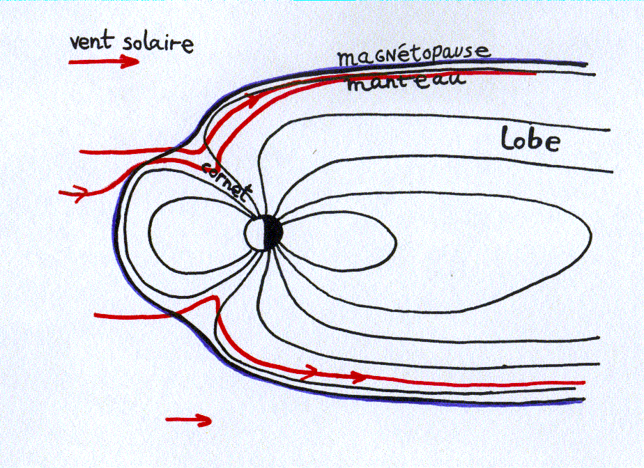 (2) Le champ magnétique dans les cornets polaires est plus fort que dans les autres régions de la magnétosphère, il s'oppose donc à la rentrée des particules chargées et à leur précipitation vers la Terre. (c'est l'effet diamagnétique).