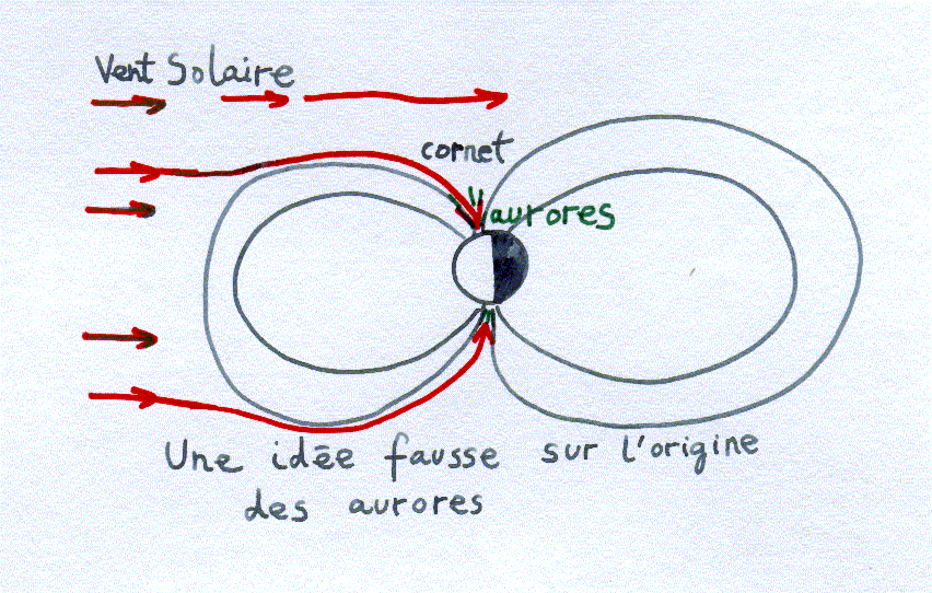 De nombreux ouvrages un peu anciens disent ou sous entendent que les particules précipitées dans les aurores proviennent directement du vent solaire, après qu'il ait pénétré dans l'environnement de la Terre par les cornets polaires. C'est faux, la réalité est plus complexe. Néanmoins, l'idée est assez répandue, y compris chez des gens cultivés. Voici quelques arguments qui montrent que ce modèle ne correspond pas à la réalité.