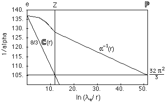 Figure 1. Variation en fonction de l'échelle de longueur r du couplage "électromagnétique" inverse courant a2-1 + (5/3) a1-1, entre l'échelle de Planck (P) et l'échelle de l'électron (e), et de 8C(r)/3, où C(r) = ln(r/LP) est une "constante" de relativité d'échelle courante. (Le facteur 8/3 prend son origine dans la brisure de symétrie électrofaible). Les deux courbes se coupent très précisément à la valeur expérimentale de l'échelle de Compton de l'électron (donc donnant sa masse), comme on s'y attend théoriquement dans la théorie de relativité d'échelle. Le couplage tracé s'identifie à la constante de structure fine courante inverse a-1 entre les échelles de l'électron et du Z. Sa variation dépend du spectre de masse complet des particules élémentaires.