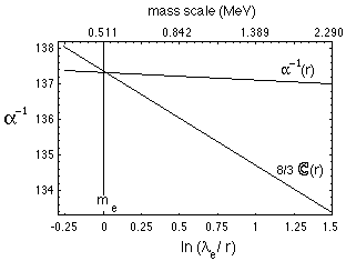 Figure 2. Vue élargie (par un facteur d'environ 50) de la région autour de l'échelle d'énergie de l'électron dans la Fig. 1, montrant le croisement précis du a-1(r) asymptotique et de 8C(r)/ 3 à la valeur expérimentale de la masse de l'électron.