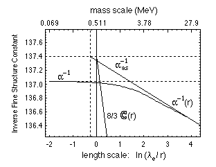 L'accord est rendu encore meilleur si on tient compte du fait que la constante de structure fine mesurée (à l'échelle de Bohr) diffère de la limite de son comportement asymptotique à haute énergie, et que la même chose est vraie de la masse courante de l'électron (voir Fig. 3).